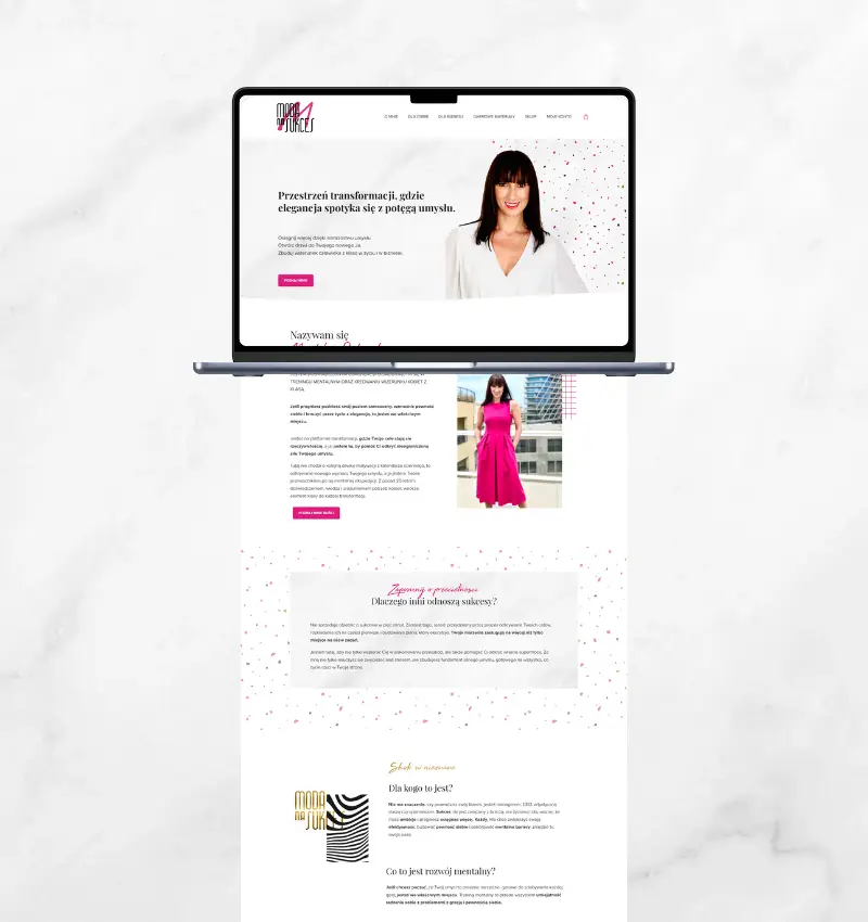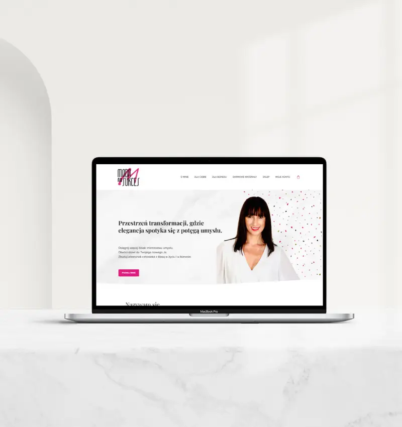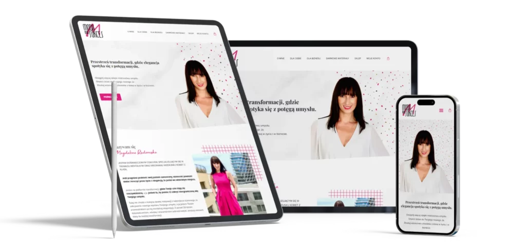 Magdalena Radomska – coach i trener mentalny – stworzyła przestrzeń, w której elegancja spotyka się z siłą umysłu. Jej marka „Moda na Sukces” inspiruje kobiety do świadomego rozwoju, łącząc profesjonalizm z indywidualnym stylem. Potrzebowała strony internetowej, która nie tylko odda jej charakter i wartości, ale również stanie się miejscem sprzedaży jej autorskich produktów.